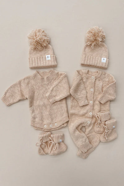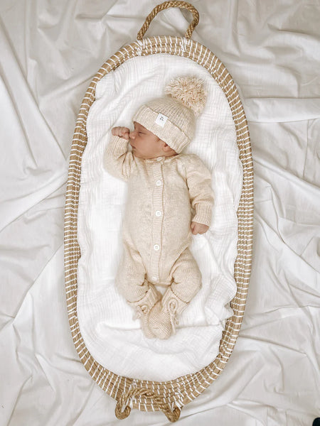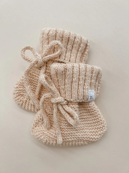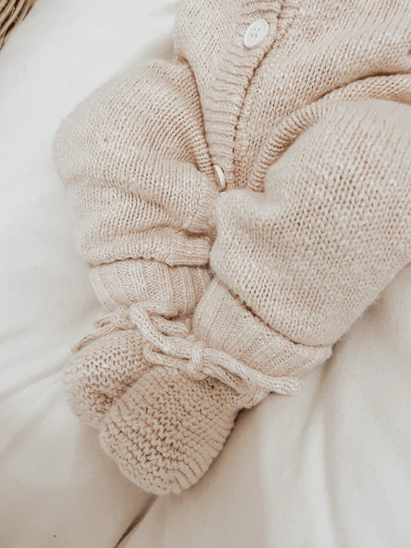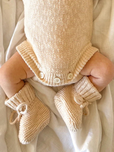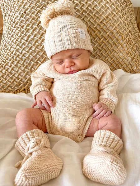 Knitted booties to complement our knitted rompers & beanies. Designed to be a timeless keepsake to remember just how teeny, tiny they were. An heirloom piece to pass down to other siblings or a special something to pop in their keepsake box. Functional drawstring to ensure booties don't fall off when worn.