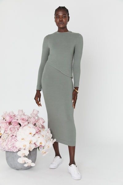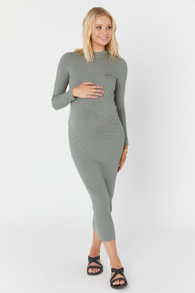 An effortless style that embodies laid back luxury, our new go-to bondycon maxi dress is crafted from our premium ribbed cotton jersey and cut in a seamless fit. Underneath the sophisticated angled top layer, our Elke Knit Dress features our coveted low dropped arm holes - simply lift the top layer for super quick, subtle and easy feed access. We love how you can style this piece up with some mules but can also pare back with some sneaks and hitch it up a 'lil for casual weekend wear for a totally different vibe...we are obsessed!