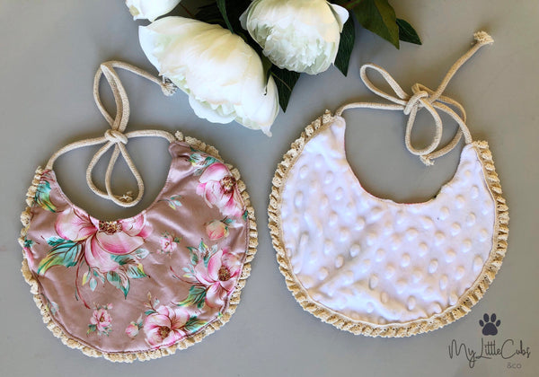 The Inflorescence Bibs Collection have the loveliest prettiest floral design prints. Reverse side are white with soft pom pom details. ⚜️